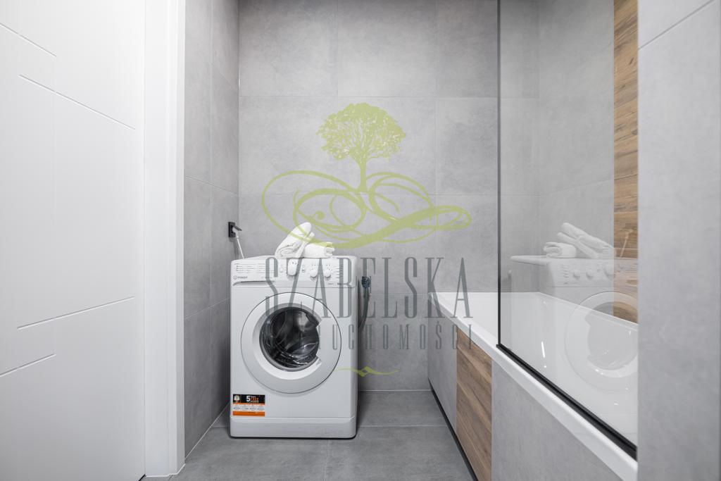 Łazienka wykończona w nowoczesnym, neutralnym stylu skandynawskim, z kabiną prysznicową oraz pralką.