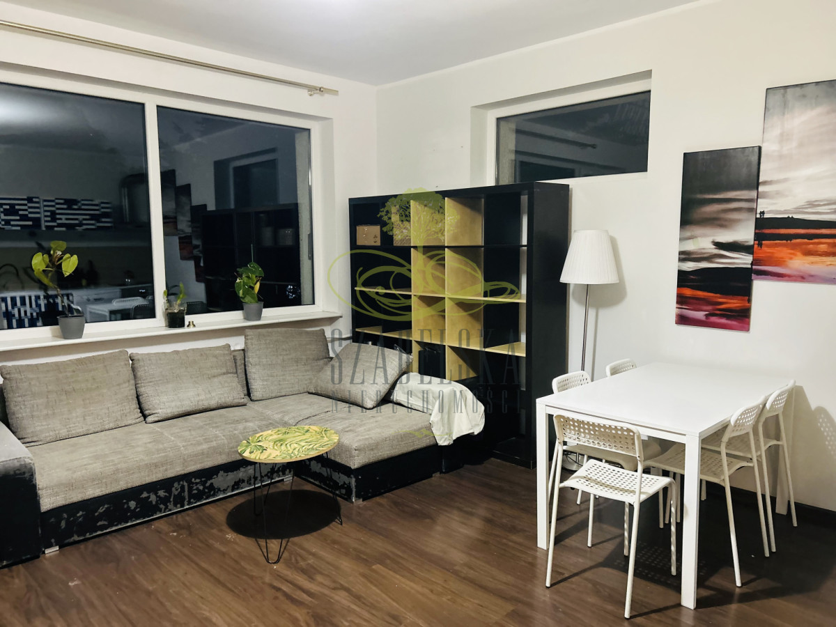 Salon- rozkładana kanapa, regał Ikea, komoda pod tv, stół plus krzesła Ikea. Aneks kuchenny z zabudową oraz kuchenką z piekarnikiem, zmywarką oraz lodówką.